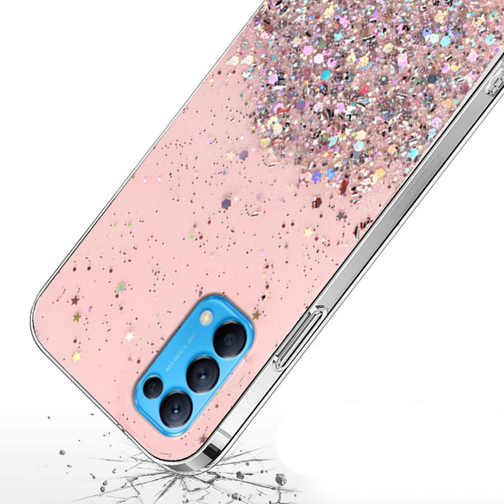 Case for OPPO Reno 5 5G, Glittery, pink is a combination of high-quality plastic and TPU materials. New quality and longer durability among cases. It does not deform, retains its functional qualities for a long time. The case has the necessary cutouts, headphone input or power connector.