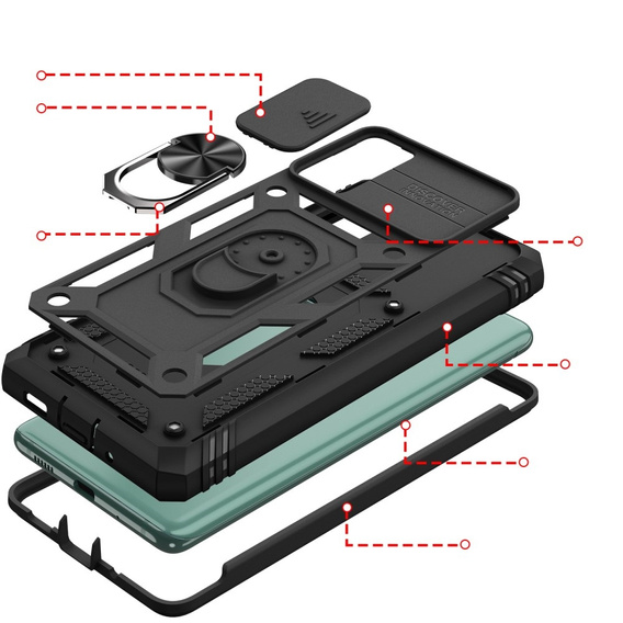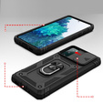 Case for Samsung Galaxy S20 FE, CamShield Slide, black case with stand option and magnetic finger grip. The case is made of high-quality materials, is fully functional and provides solid protection for your device. The cap is made of plastic and flexible hardened TPU rubber. The back has a practical metal finger grip that can be used as an attachment to a car magnetic mount. The case has reinforced corners and edges, solidly protecting the phone from damage. An additional frame protects the sides and corners of the smartphone and effectively insulates the screen from the surfaces on which it lies. The case fits the specific model of the device, has the necessary cutouts and buttons, and is fully functional.