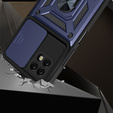 Case for Realme C21, CamShield Slide, blue case with stand option and magnetic finger grip. The case is made of high-quality materials, is fully functional and provides solid protection for your device. The cap is made of plastic and flexible hardened TPU rubber. The back has a practical metal finger grip that can be used as an attachment to a car magnetic mount. The case has reinforced corners and edges, solidly protecting the phone from damage. An additional frame protects the sides and corners of the smartphone and effectively insulates the screen from the surfaces on which it lies. The case fits the specific model of the device, has the necessary cutouts and buttons, and is fully functional.