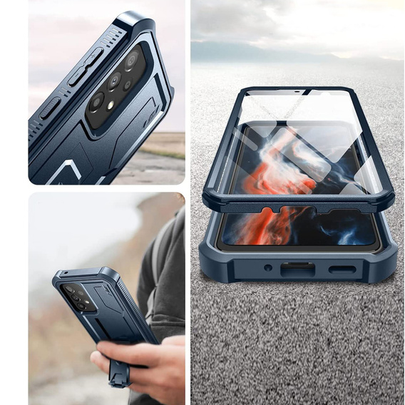 Armored case for Samsung Galaxy A33 Dexnor Full Body, Dexnor Full Body, dark blue is one of the most protective and durable products in our entire range. The case consists of a back that has a built-in stand for more comfortable viewing of content on the smartphone's screen, as well as providing a more secure grip, as it can be used as a finger grip. The frame for the front of the device is made of a blend of soft thermoplastic material. It has a built-in film that further protects the screen from scratches and damage. These combination will take care of your phone's safety even during extreme situations.