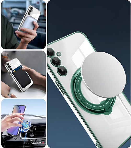 Magnetic Case for Samsung Galaxy S24 FE, for MagSafe, green provides very good protection against mechanical damage without noticeably increasing the size of the smartphone. The cover is durable and lightweight. High edges around the lens protect it from being broken or scratched. The whole thing fits perfectly to the device without increasing its weight and dimensions. The case has a built-in magnetic cap that allows the use of MagSafe accessories. The built-in fold-out stand will improve comfort while watching movies.