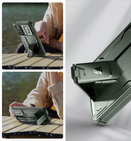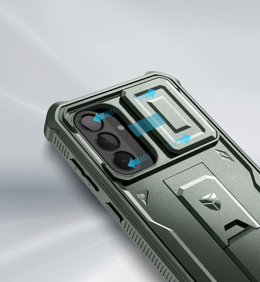 Armored case for Samsung Galaxy A56 5G, Dexnor Full Body (Two Frames), green is one of the most protective and durable products in our entire range. The case consists of a back that has a built-in stand for more comfortable viewing of content on the smartphone screen and also provides a more secure grip as it can be used as a finger grip. The frame for the front of the device is made of a blend of soft thermoplastic material.It has a built-in film that further protects the screen from scratches and damage.This combination will ensure the safety of your phone even during extreme situations.