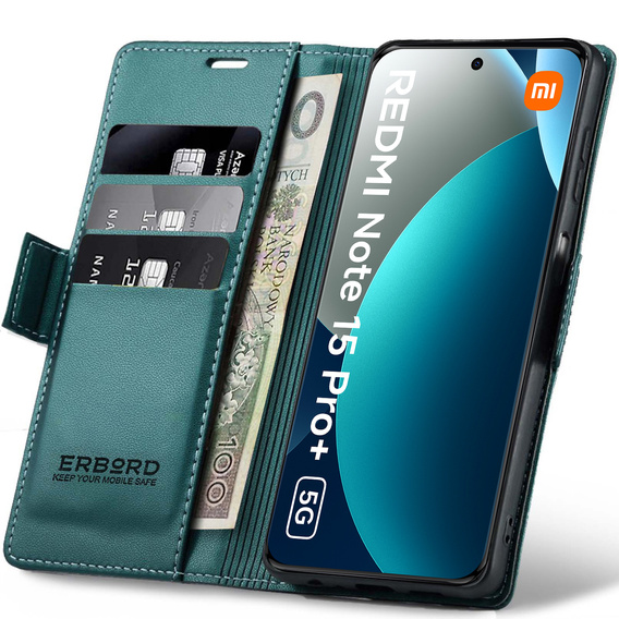- 1 × ERBORD Glossy Litchi flip wallet case for Xiaomi Redmi Note 15 Pro Plus 5G / Poco M8 Pro 5G - green